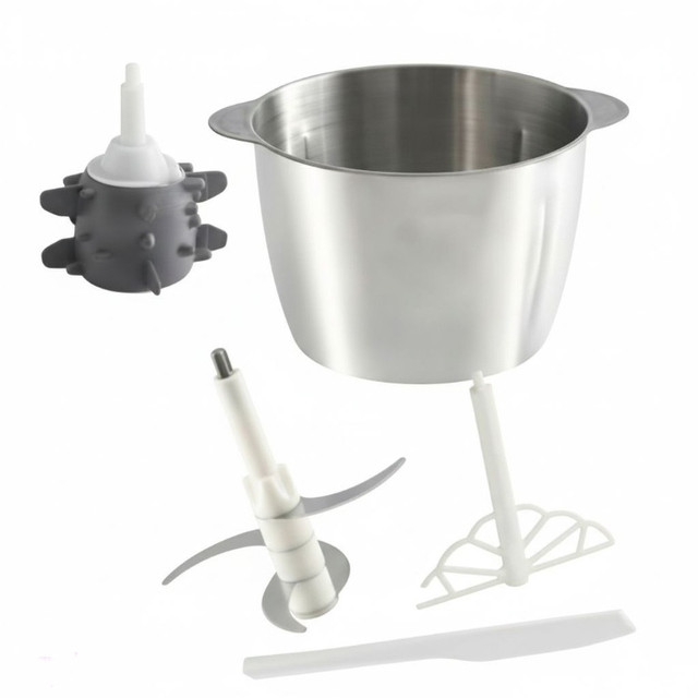 کاسه شیشهای، کاسه استیل، پایه سیر پوستکن، همزن تخت، لیسک پلاستیکی