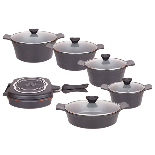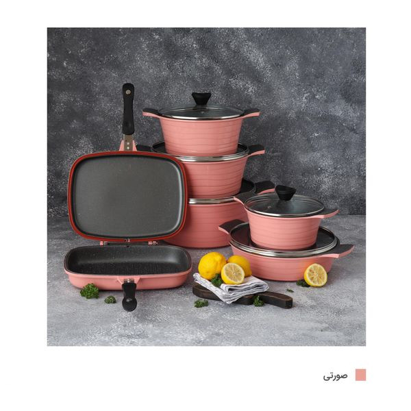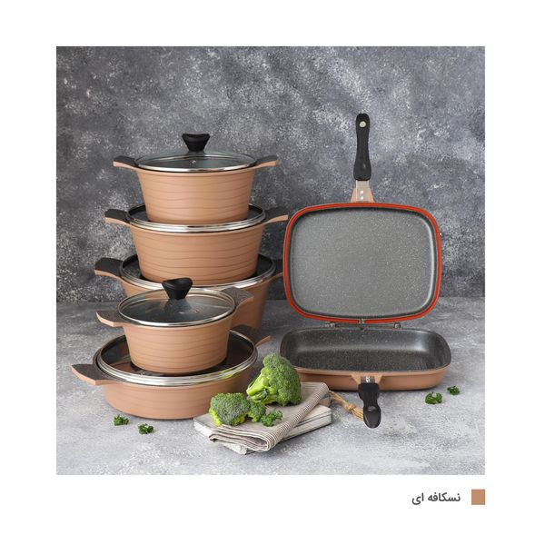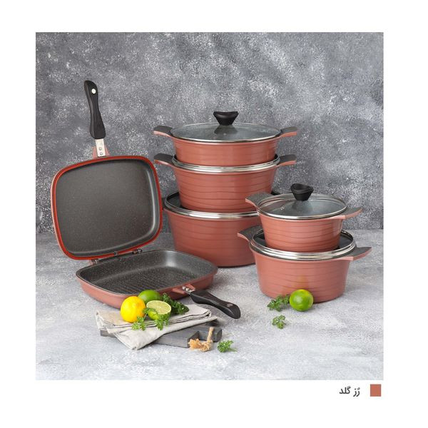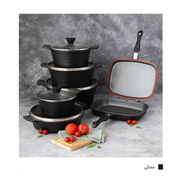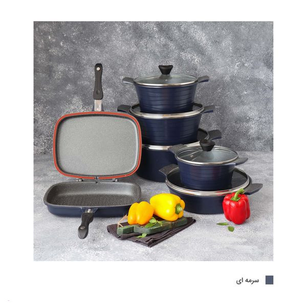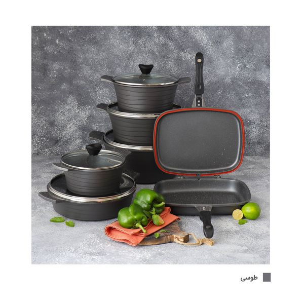قابلمه سایز ۲۸ به ابعاد ۳۷×۱۲×۲۹ سانتیمتر و وزن ۲۰۰۰ گرم، قابلمه سایز ۲۴ به ابعاد ۳۵×۱۲×۲۵ سانتیمتر وزن ۱۶۴۰ گرم، قابلمه سایز ۳۲ به ابعاد۴۳×۱۴×۳۳ سانتیمتر و وزن ۲۳۲۵ گرم، قابلمه سایز ۲۰ به ابعاد ۲۹×۱۰×۲۱ سانتیمتر و وزن ۱۰۷۵ گرم، تابه دو دسته سایز ۲۸ به ابعاد ۴۸×۸×۲۹ سانتیمتر و وزن ۱۹۸۰ گرم، تابه دوطرفه سایز ۳۲ به ابعاد ۲۲×۷×۳۰ سانتیمتر و وزن ۱۹۰۰ گرم، اقلام سرویس پخت و پز: قابلمه و تابه، ویژگی ظرف پخت: در پیرکس، در با سوپاپ تخلیه بخار، قابلیت استفاده در: فر، قابل شستشو: با دست